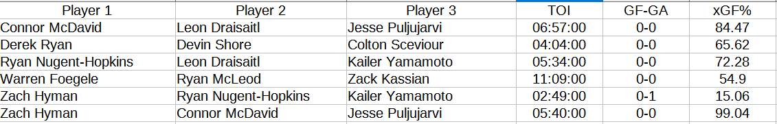 Hyman-McDavid-Puljujarvi is my favourite line right now, and Nuge-Draisaitl-Yamamoto had good xGF% too. Nuge can’t drive a line.