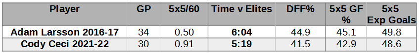 Ceci has endured a tough start to his first Oilers season, I think he’s better than his numbers but things need to start going his way. His DFF and goal differential trail Larsson during the toughest part of the Swede’s 2016-17 season, although expected goals are about even. Ceci is 17-19 with Keith this year, 4-9 with all others (these numbers are five-on-five.