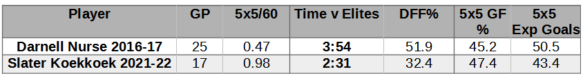 Nurse is playing big minutes for Edmonton against elite competition and enjoying the edge (DFF%) in shot share and expected goals over Sekera. The actual goals favour Sekera, but regression should close that gap by season’s end. By the way DFF% and Time v. elites are via Puck IQ, the rest from NST.