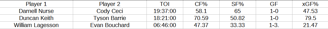 I thought Nurse-Ceci and Keith-Barrie looked good, although Nurse has stopped making clean outlet passes and is back to icing the puck. I don’t think he’s 100 percent yet. Ceci’s penalty really hurt, damnable thing, Barrie’s first period mistake was also a kick in the head.