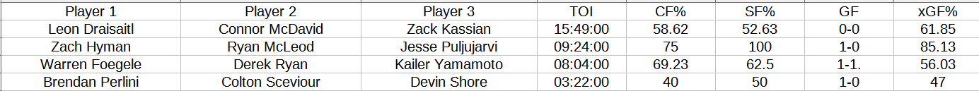 Hyman – McLeod – Puljujarvi were tremendous. Wow that could easily be a very good second or third line. Possession demons, particularly Hyman. All three of those guys are effective on zone entries. JP was turning over pucks as per usual.