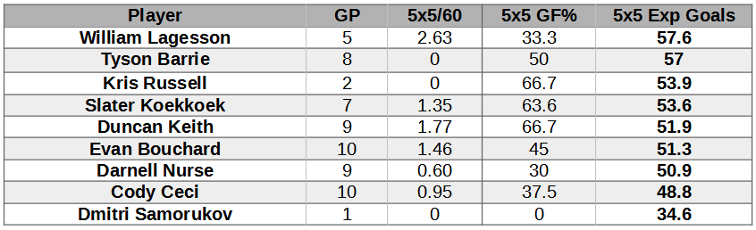 Defensively, Nurse has had a crushing six weeks, although his expected goals are in the range of expectation. Duncan Keith has flat out delivered in his minutes in the last 10 games, although there seems to be some disagreement in how much he’s playing against elites compared to other Oilers defenders.