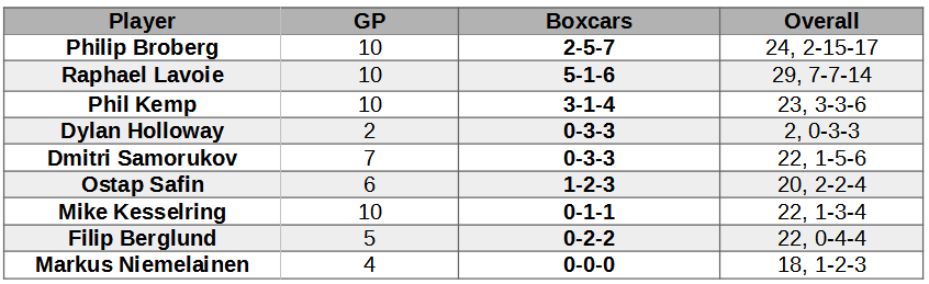 There are some nice prospects on that list, and some real progress over the last 10 games. Lavoie is coming into his own at the AHL level now, that shot is going to get him a look in the next 18 months. Broberg and Holloway are first-round picks showing their pedigree and Kemp has taken a step forward in recent games. Samorukov and Niemelainen have a lot of their value tied up on the defensive side of the puck. Olivier Rodrigue has played in three of the last 10 games and has a .920 save percentage in those games. Nice numbers here.
