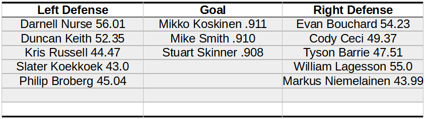 These aren’t lines, rather rankings of five-on-five points-per-60. There’s a good chance we’ll be talking Evander Kane for the next 24 hours, and it brings up some interesting possibilities. Ryan Nugent-Hopkins could move to center, but the No. 3 line just doesn’t play that much. So, I think the better plan is to run the six best roster forwards on the top two lines.