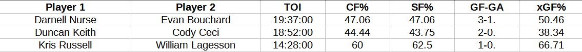 Darnell Nurse and Evan Bouchard put together a solid performance, some of the possession numbers are score effects and this duo was not strong with the McDavid line (2-5 Corsi, no shots in 6:33!) but it was first game for Kane. This pair was on the ice when Nuge line was doing much of its damage. Both Nurse and Bouchard had assists, Nurse’s coverage on the Josh Anderson goal was tight but a timely rebound Anderson spotted first was the difference. I like this pair, they are 14-17 five-on-five goals but 57.6 percent expected goals.