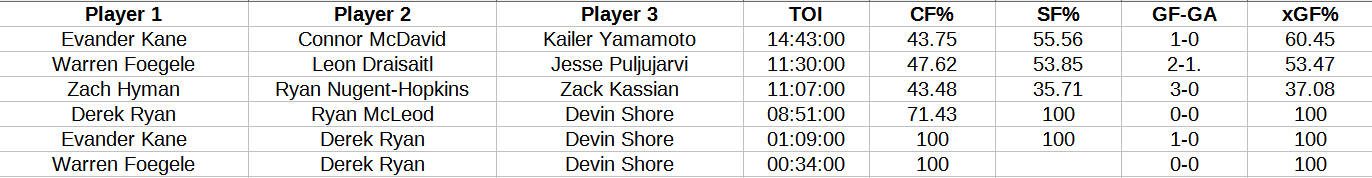 The McDavid line scored first and won the shot share, expected goals and actual goals. The unit didn’t have much chemistry, for me it makes sense to run Jesse Puljujarvi on that line tomorrow night. JP is the most familiar winger to 97, and other candidates (Leon Draisaitl and Zach Hyman) had success on other lines. Yamamoto had a nice assist, Kane scored the opening goal. McDavid had a spurt in the third period but things didn’t rhyme. Chemistry takes time, I wouldn’t sweat it.