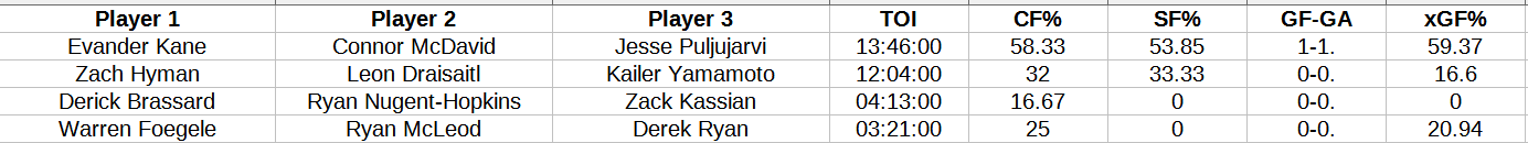 Ryan Nugent-Hopkins had two shots on goal, and was far more effective with Warren Foegele and Derek Ryan. In five minutes with Foegele, the goal share (1-0), the shot share (5-2) and expected goals (70 percent) were all top drawer compared to Brassard-Kassian. I wonder if Woodcroft was holding back on putting the band back together? Anyway, the trio fit like a glove last night.