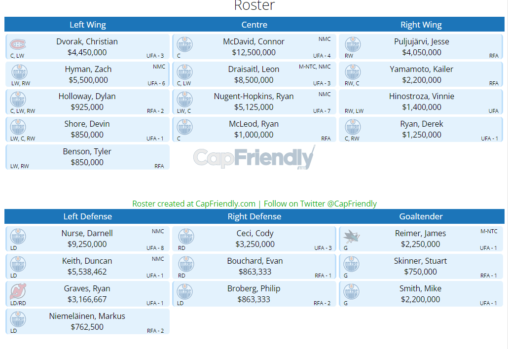 I just recently did a oilers cap friendly for next year. I had traded Barrie and kassian for picks so that is about 8m cleared. Cap increases to 82.5m next year. Signed Yamo and Pulj long term. McLeod and Kane short term. Resigned Kulak for 2m (could be any ufa dman signing for around that much). And signed Deslauries to 1m (I still think the oil need a ruffian to compete in the division and he is an actual very good player outside of the toughness. Have Holloway making the team on third line with nuge and Foegele. Team is steady Eddy from top to bottom forward and defence wise but here’s the kicker. I have no more money and smith and Stuart starting the year at goalie (terrifying)