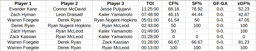 Evander Kane had an assist (SH), four shots, three HDSC (one at five-on-five), four hits and a giveaway. Connor McDavid posted two assists, three shots, one HDSC, two takeaways and took a penalty but got his money’s worth. Jesse Puljujarvi had two shots, HDSC, and his forechecking led to several chances (including early in the game). He tried to deflect a pass from the point but got too much of it, and had another good look but didn’t get all of it. Ah, the scoring slump. He’ll get there. The line was extremely effective on the night.