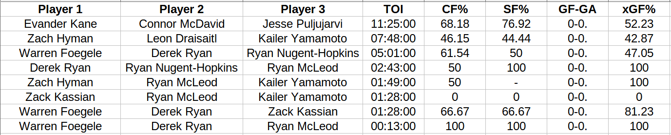 Evander Kane had an assist (SH), four shots, three HDSC (one at five-on-five), four hits and a giveaway. Connor McDavid posted two assists, three shots, one HDSC, two takeaways and took a penalty but got his money’s worth. Jesse Puljujarvi had two shots, HDSC, and his forechecking led to several chances (including early in the game). He tried to deflect a pass from the point but got too much of it, and had another good look but didn’t get all of it. Ah, the scoring slump. He’ll get there. The line was extremely effective on the night.