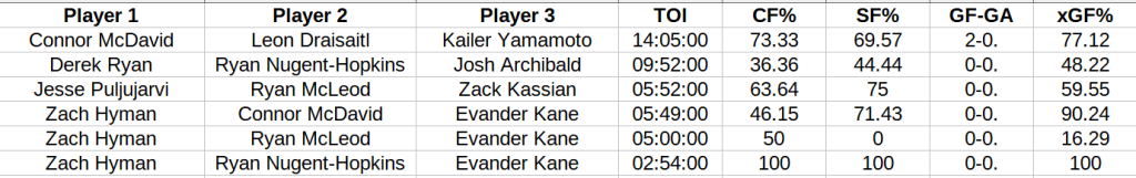 Jesse Puljujarvi is skating with power again, that could be a key addition for the next series. He had one shot on goal, two hits. Ryan McLeod had one shot, two giveaways and FIVE takeaways on a night I thought he stepped up when the team needed him. Zack Kassian had three shots, seven hits and a takeaway, plus a high danger scoring chance. Just when I had calmed down about Kassian’s reckless hits, I read Travis Yost saying something like “he’s a penalty waiting to happen” and that’s about right. His presence in the Calgary series could be a big story.