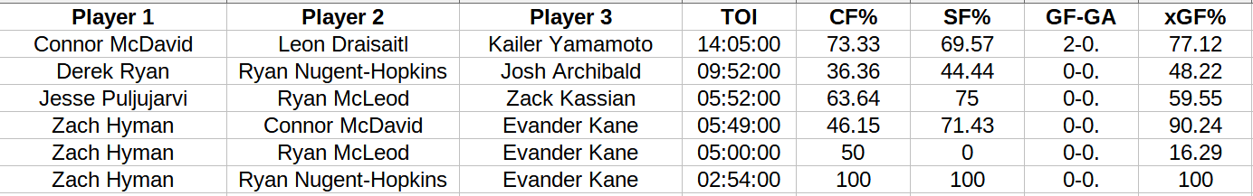 Jesse Puljujarvi is skating with power again, that could be a key addition for the next series. He had one shot on goal, two hits. Ryan McLeod had one shot, two giveaways and FIVE takeaways on a night I thought he stepped up when the team needed him. Zack Kassian had three shots, seven hits and a takeaway, plus a high danger scoring chance. Just when I had calmed down about Kassian’s reckless hits, I read Travis Yost saying something like “he’s a penalty waiting to happen” and that’s about right. His presence in the Calgary series could be a big story.