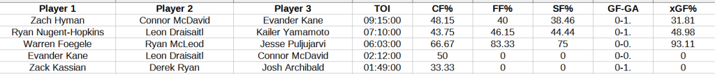 Brett Kulak had three blocked shots, worked hard, recovered pucks, I was genuinely surprised he didn’t move up the depth chart. Tyson Barrie had three shots, six attempts, the only downbeat was shot selection on the PP. Passes didn’t have zip and things were predictable. The 0-2 goals in the table above is incorrect.