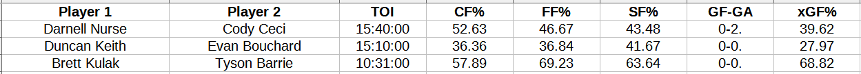 Brett Kulak had three blocked shots, worked hard, recovered pucks, I was genuinely surprised he didn’t move up the depth chart. Tyson Barrie had three shots, six attempts, the only downbeat was shot selection on the PP. Passes didn’t have zip and things were predictable. The 0-2 goals in the table above is incorrect.