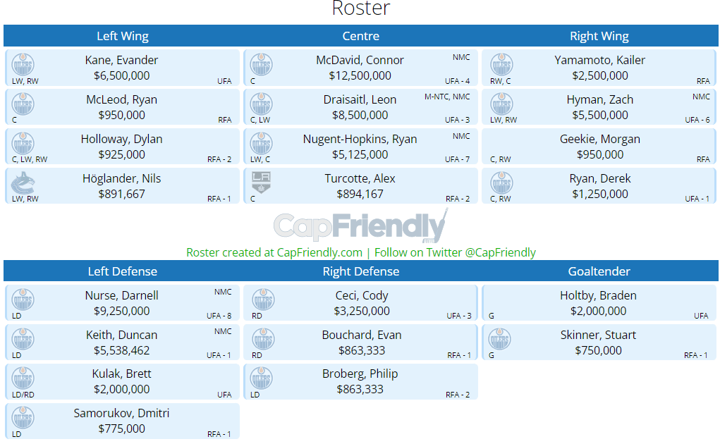 - Explain yourself. Using Kevin Weekes quotes (“starts with a 7”), I riffed a deal for Kane that extends him six years. I don’t know if that’s going to be enough, and it could be too much, but we know Holland is aggressive once he makes a decision on pursuit. Mike Smith retired, Tyson Barrie was traded to Seattle for Morgan Geekie, Warren Foegele to LAK for Alex Turcotte, Jesse Puljujarvi for Nils Hoglander. Zack Kassian gets bought out. There’s not quite $1 million in cap room, since Edmonton is LTIR maybe they recall Seth Griffith to run it close to the cap.