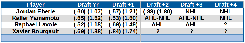 This is goals-per-game and points-per-game in each year of a prospect’s development. Jordan Eberle went to the NHL right out of junior, Yamamoto had a couple of false starts and Raphael Lavoie hasn’t been able to establish himself as a true NHL prospect while playing in Bakersfield.