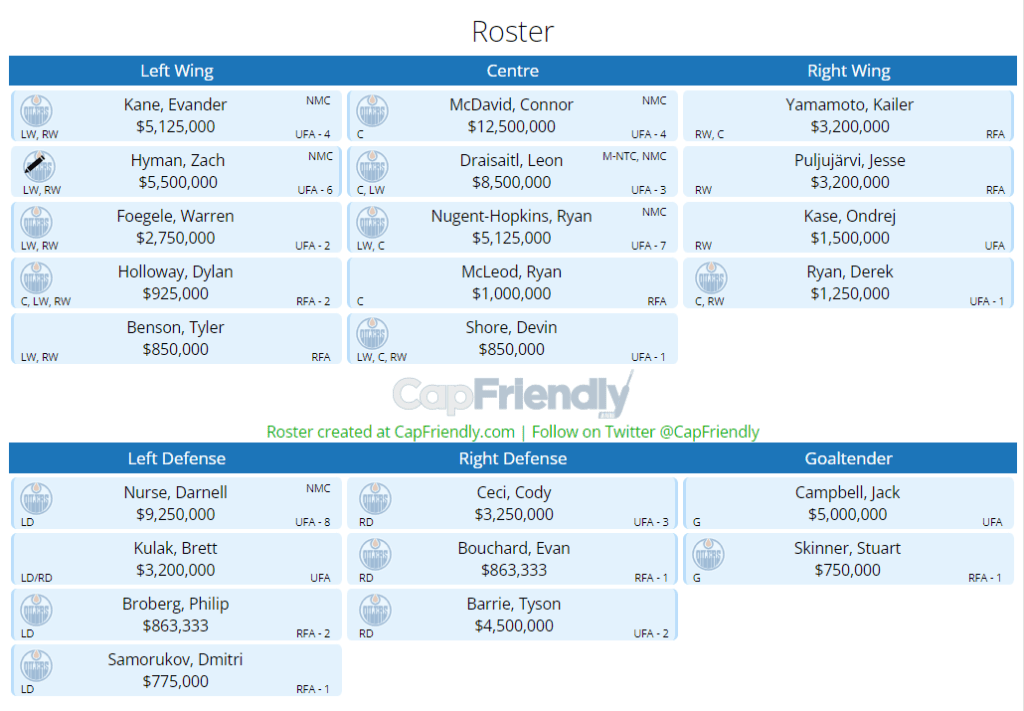 There’s just one problem: It’s over by $3 million. Tyson Barrie, Jesse Puljujarvi and Warren Foegele are possible exits to get under the cap. I would also pay close attention to the RFA signings. Holland can’t squeeze JP and KY (arb rights) but he’ll need to play hardball.