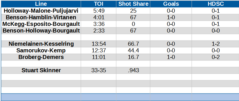 - The fourth line didn’t appear on the NST “lines” drop down so I had to go searching for it this morning. The trio played 5:06, 50 percent shots, 0-0 goals, 1-0 HDSC.
