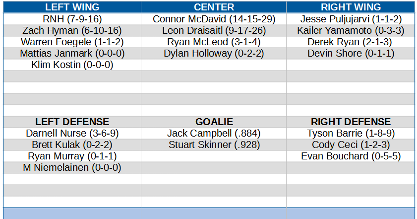 Vegas had all their players healthy at the end of the year and couldn’t get it together to make a push for the playoffs. Doesn’t matter, I prefer the Oilers roster regardless of how the first 15 games of an 82 game schedule has gone.