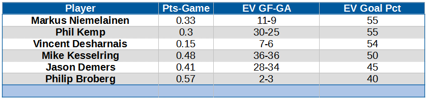 Phil Kemp and Mike Kesselring are the notable players who are pushing but haven’t yet made their NHL debuts. I’m not enough of a scout to say either man will have a career, and history suggests a cup of coffee is all they could hope for as an NHL career. Still, they are RH, young enough to push for several more years and Kesselring specifically is getting attention for his 12 goals (league-leading total among defensemen). Kemp is the better defender and that has value.