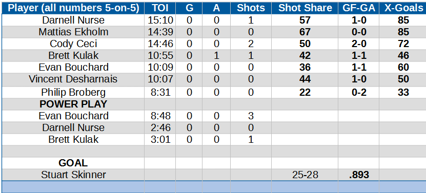 Darnell Nurse had a fine game, his minutes are going down and quality of play is rising. I noticed Woodcroft deployed him with Mattias Ekholm late in the period, interesting strategy Jason Gregor mentioned could happen during the TSN1260 trade deadline show yesterday. Ekholm has played two games and at five-on-five the on-ice numbers with the two big centers (isolated, so excluding 97-29 time together) are close: 2-0 goals in 9:42 with McDavid, and 2-0 goals in 13:04 with Draisaitl. In 31:43 at five-on-five overall, Ekholm is 4-0 goals. Cody Ceci and Brett Kulak played well in defensive roles.