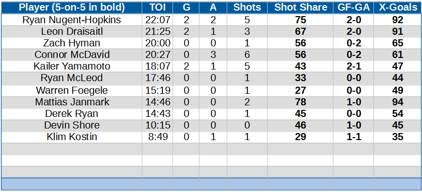 Woodguy uncovered the unholy alliance that is Draisaitl-Ceci a few days ago, and looked at the Draisaitl-Eklholm combination in this tweet. Early days of course, but it shows the coaching staff sees the issue and also shows Ekholm has had the desired impact early early early.