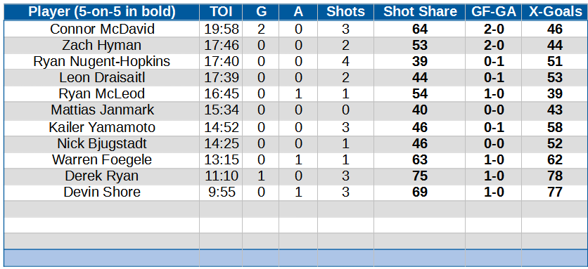 Mattias Ekholm and Evan Bouchard had a quieter night (just two HDSC against) and the puck was headed in a good direction for this duo. EKholm-Bouchard have played 53 minutes together five-on-five and are 6-2 goals. Impressive.