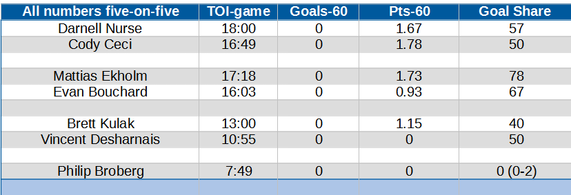 Notice the time-on-ice numbers, and how much Mattias Ekholm has impacted the game. He may well be running luck in goal share but his ability to stand up at the blue line, retrieve the puck cleanly, and send it to daylight with tape-to-tape passes is absolute music! The other impact is on all of the other blue. When players who have been deployeed too much (Nurse has seen his ice time reduced by almost one minute in the discipline), or too high in the batting order (Kulak), finally land where they belong, more music! Absolute home run addition.