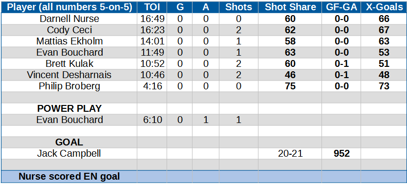 Nick Bjugstad had a strong evening. Five shots, two HDSC, drew a penalty, takeaway, six hits, 10-3 on the dot. Had a grand look late, I think he thought he had scored on the play based on his resting hockey face after the event. One of nine Oilers who spent 2+ minutes on the PK, all effective kills. Kailer Yamamoto drew a penalty, had one HDSC, and looks to be back. Took a nasty spill late in the game, I worry about his neck and that hit against the back boards could not have helped. Derek Ryan had an effective night, heady play with and without the puck. Took a vicious hit to the back late, no penalty and just an extremely poor decision by the black and white stripes.