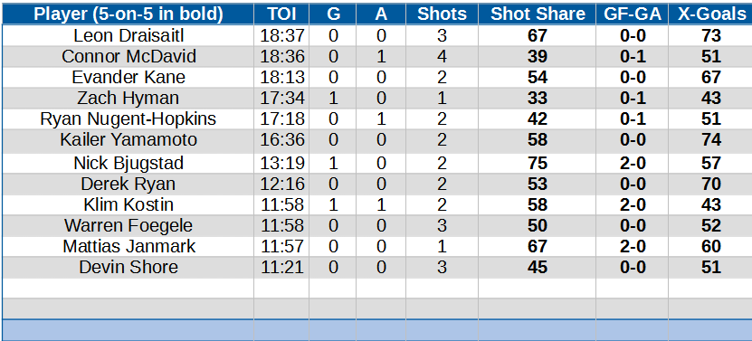 Darnell Nurse and Cody Ceci had a strong game, 1-0 goals and 68 percent expected goals together. Nurse has played well all year, but there’s more maturity in his game recently. I think it comes from not trying to do too much, a reflection of real help on the other big pairing (Ekholm). Nurse has a 51 percent goal share for the season, Ceci now at 48 and climbing.