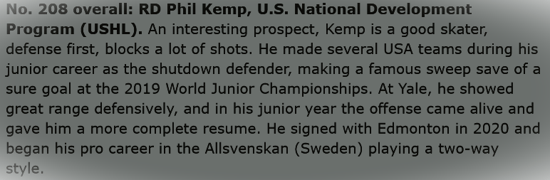 The Edmonton Oilers recalled Phil Kemp late yesterday afternoon. It’s his first trip to the NHL during a regular season and reward for steady work defending the house over several years. For his career (four seasons) with the Bakersfield Condors, Kemp has been suppressing offence. His even-strength goal share (102-81, 56 percent) over those four years is rock solid. The Condors are 53 percent when Kemp is off the ice during those years at even strength.