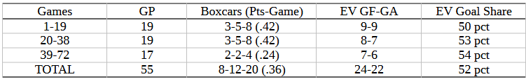 As a rookie, Bourgault boasted a .55 pts-game average and an even-strength goal share of 60 percent. He should have been pushing beyond those totals, it hasn’t happened. We’ll have a long look later, but I want to say that even now, with his second season in the books, we should wait for Bourgault to tell us what he is. There’s one more year of entry and maybe he’ll need a little more. Perhaps it will take a second organization. Not sure. I can say we need to watch this play out, prospects don’t develop in a straight line.